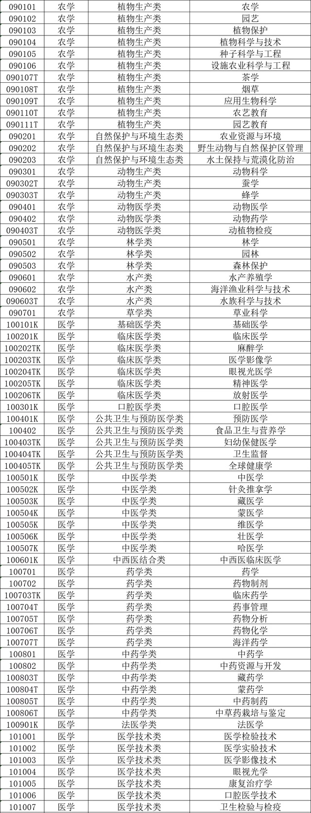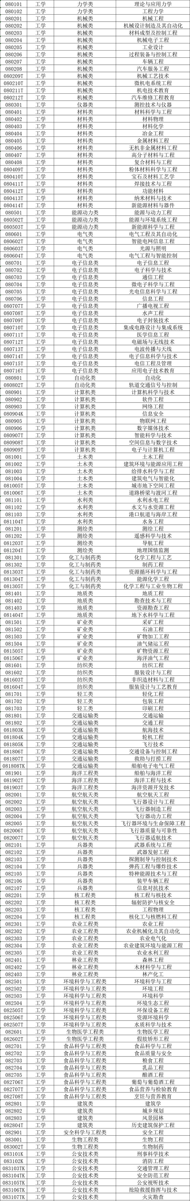 专科学科门类:交通运输类、土建类、资源开发与测绘类、农林牧渔类、医药卫生类、财经类、公安类、制造类、文化教育类、水利类、生化与药品类、轻纺食品类、公共事业类、材料与能源类、法律类、环保、气象与安全类、电子信息类、艺术设计传媒类、旅游类;