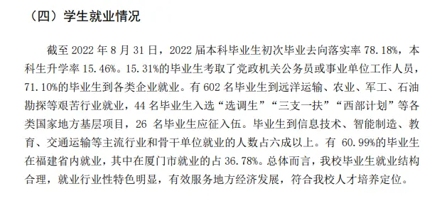 据相关资料显示:截至2022年8月31日,2022届本科毕业生初次毕业去向落实率78.18%,本科生升学率15.46%。15.31%的毕业生考取了党政机关公务员或事业单位工作人员,71.10%的毕业生到各类企业就业。