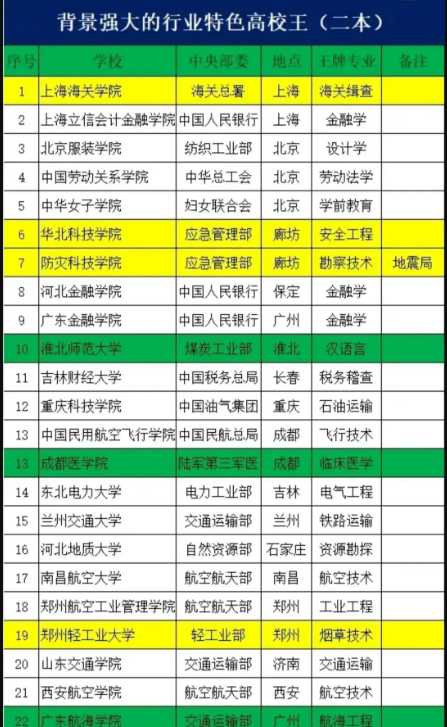 背景强大的22所行业特色高校(二本层次),高考中低分数段的同学可以重点考虑。