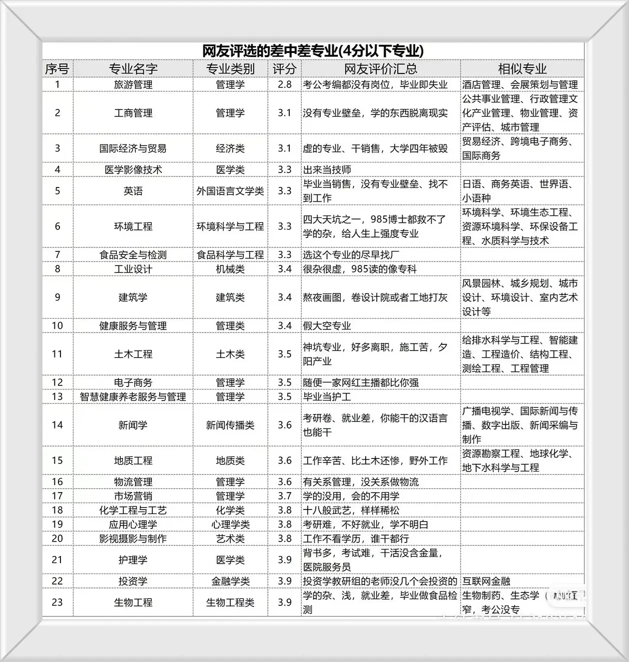 根据网友整理的最烂专业榜单显示,旅游管理专业评分为2.8分,不建议原因是因为该专业考公考编时确实面临岗位相对较少的情况,被很多同学认为毕业及失业,不值得选择;其次不建议的专业为工商管理,评分为3.1,不建议原因为没有专业壁垒,学习内容更多的是纸上谈兵,比较脱离现实,很难运用到现实工作上,以下是网友评选的最差专业榜单一览表: